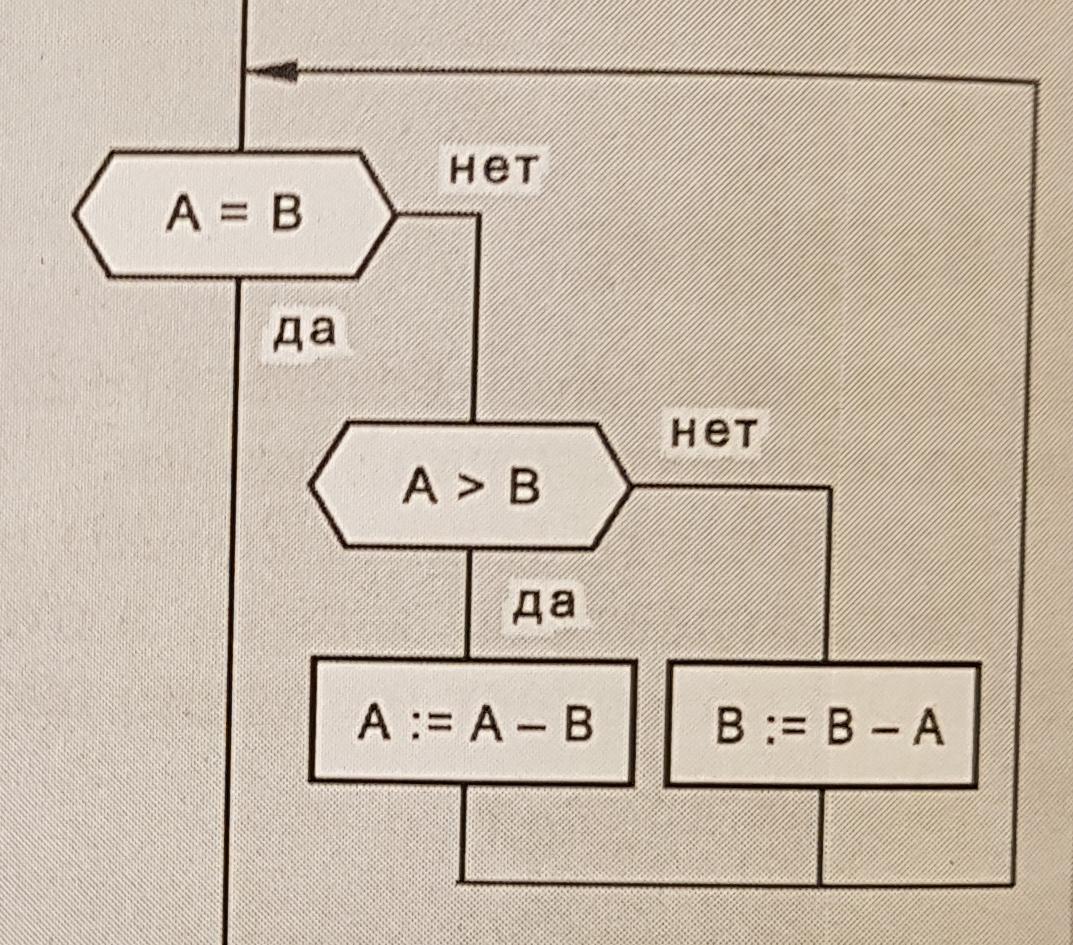 Там после иконы Действие с текстом "B := B - A" лиана стоит на стрелке цикла, и это хорошо.