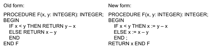 Кстати, в выше упомянутом Оберон-07 return в функциях возможен только как последний оператор. И такое ограничение влияет на структуру даже элементарных алгоритмов:
