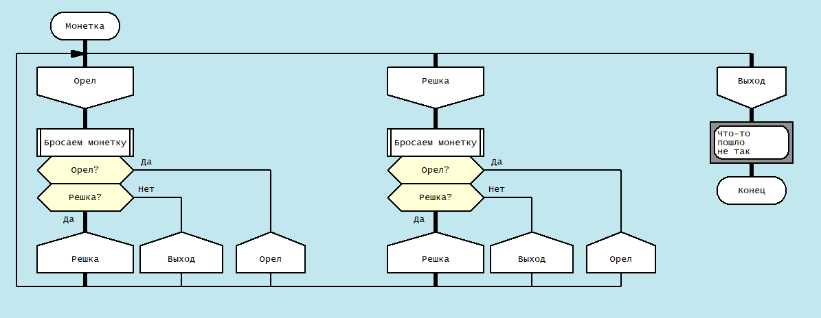 Если бы ДРАКОН позволял бы также комбинировать варианты ребер с одним узлом, он бы, как мне кажется, выиграл.