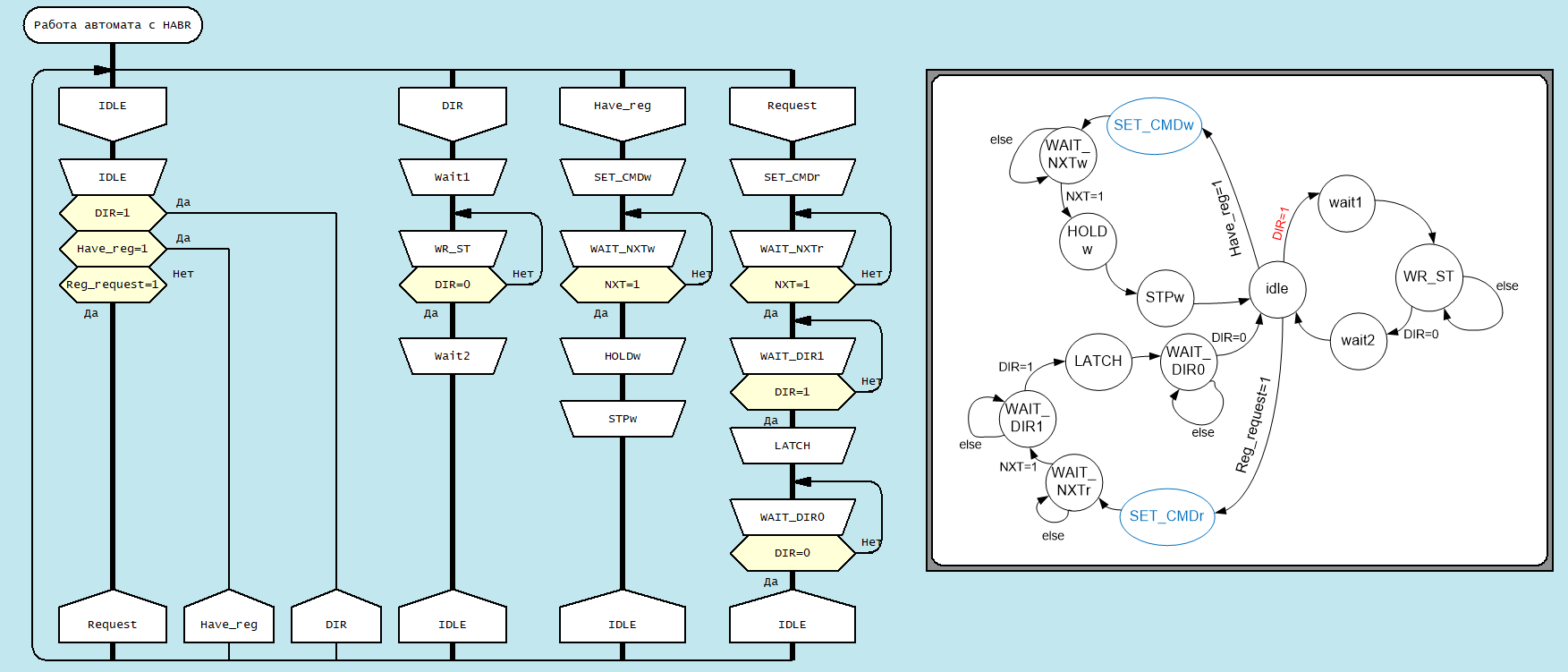 Названия веток - это названия процессов переходов состояний автомата, за исключением ветки IDLE. Она повторяет название узла состояния, которое на ней описано.