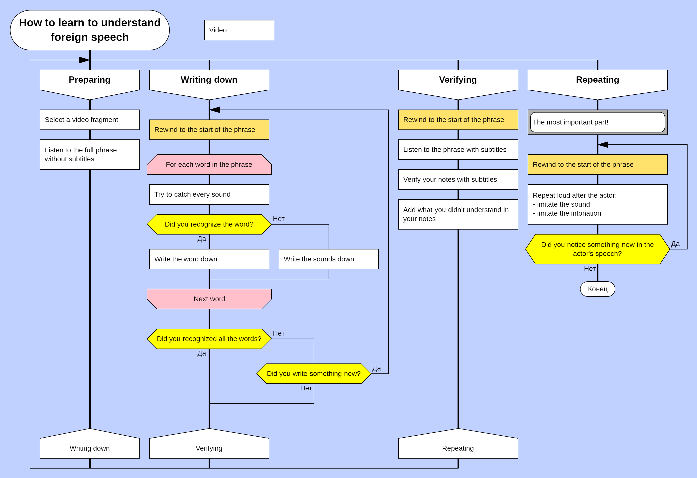 3.3 В четвёртой ветви я снова столкнулся с непродуманным условием выхода из цикла. "Несколько раз" - субъективная величина, а пустая икона "конец цикла для" так и притягивает взгляд. Почему здесь не используется тот же "предел понимания"? То есть повторение происходит по иной причине. Человек повторяет слова до тех пор, пока незнакомые ему звуки не будут сочетаться на интуитивном уровне, пока в речи актёра из видео он не будет ощущать чего-то особенного. Следовательно, счётчик лучше заменить на цикл.