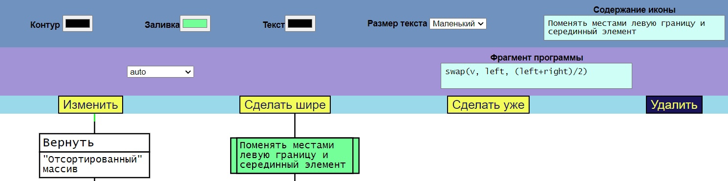 Хотел бы предложить свою дракон-схему алгоритма быстрой сортировки. Так получилось, что через эту тему я продемонстрирую прогресс в совершенствовании своего редактора Дракон-Си. За основу взят тот же алгоритм, что и у Алёны Ноздрановской. Этот код можно увидеть и в литературе Кернигана и Ритчи.