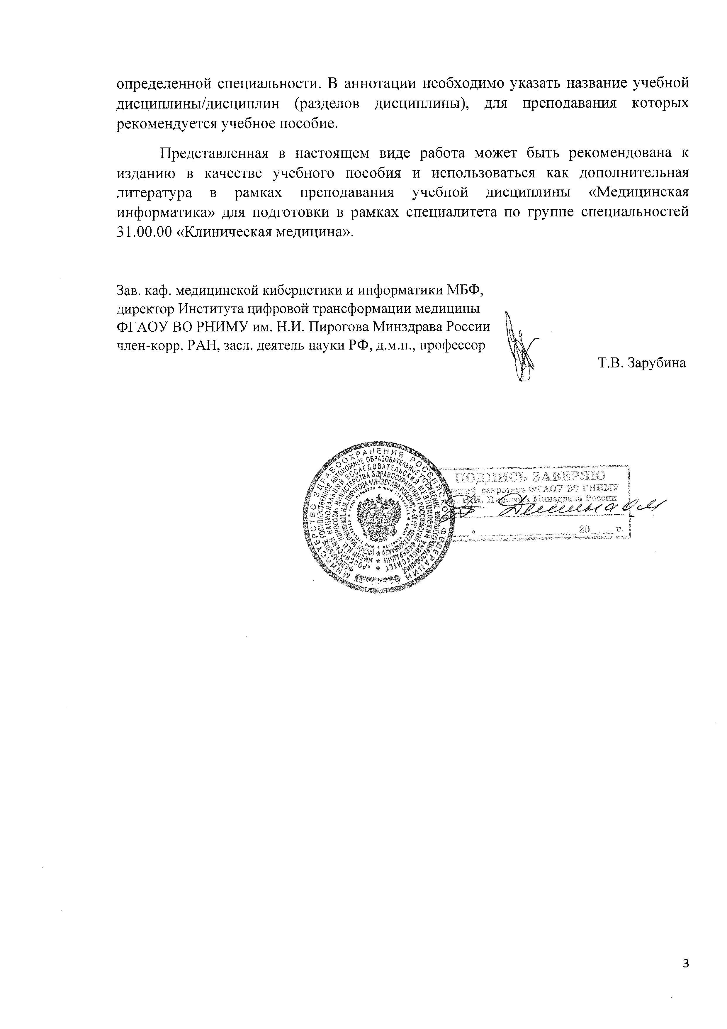 Рецензии на учебное пособие, представленные на экспертизу в Департамент здравоохранения МосквыРецензенты, давшие отзыв на учебное пособие1. Зарубина Т. В. — доктор медицинских наук, профессор, член-корреспондент РАН, заслуженный деятель науки РФ, заведующая кафедрой медицинской кибернетики и информатики Медико-биологического факультета, директор Института цифровой трансформации медицины Российского национального исследовательского медицинского университета имени Н. И. Пирогова.