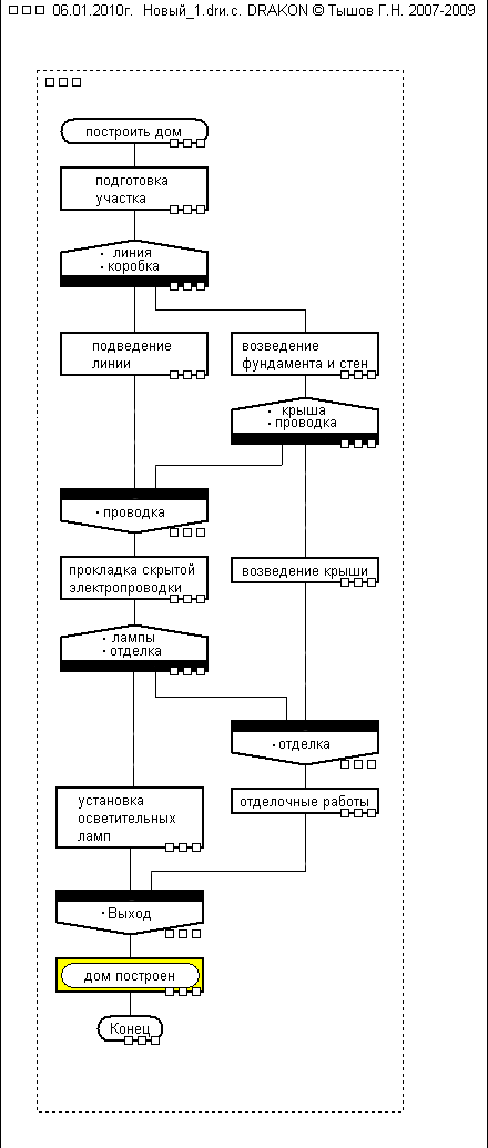 И я о том же - все схемы с расщеплением рабочей точки есть доалгоритмические модели деятельности. Так что язык таких схем - это точно не часть ДРАКОНа, но можно считать его ещё одним членом семейства визуальных маршрутных подъязыков; на его базе определяется техноязык формализации поведения (независимого, в т.ч., возможно, параллельного исполнения) целевых (решающих задачу) алгопроцессов (для удобства дадим этому языку рабочее название, например, мультишампур-язык, кратко - МШ-язык). Соответственно говорим: "техноязык ДРАКОН"; "техноязык МШ"; здесь "техно" означает принадлежность к импер-языкам, наследующим общие идеи Паронджанова - графовой визуализации маршрутов деятельности и эргономизации описаний в целом.