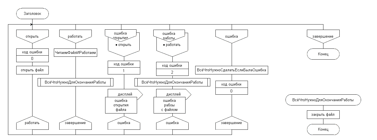 В случае возникновения исключения в самом внутреннем блоке try, действие Закрыть файл будет выполнено в любом случае (блок finally), а действие Error := false выполнено не будет, так как после finally управление перепрыгнет в Показать "Ошибка работы с файлом" (ближайший except).