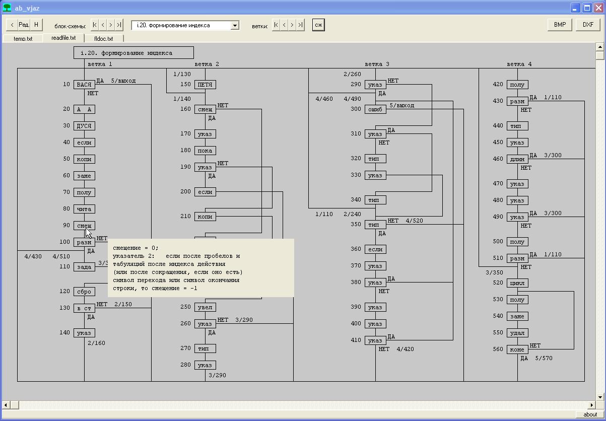 Кстати, идея - оформить вершины ВЯЗБС-схемы "под диалоговые окошки" - где номер вершины и название (операция) пишется в заголовке окна, а внутри канвы идут строки операндов с полями имени и значения в каждой. На месте строки состояния окна - ссылка на номер следующей вершины (для условной - пара ссылок - по главной и побочной вертикалям); от поля ссылки и отходит ребро (на побочную вертикаль - с изломом влево); чтобы было совсем по правилам шампур-метода - ссылки от условия ставим "этажами", причём на побочную вершину - поверх ссылки на главную, делая от её строки отвод сразу влево.
