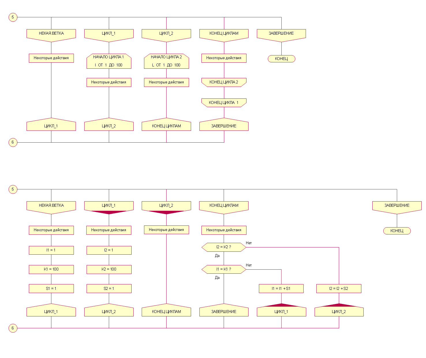 Эдуард "графитно" объяснил всё за меня. Ваши ответы ему я также принимаю. И вот из них следует одна вещь - если многоветочный ДЛЯ допускаем, то должны ориентироваться не только на топологию схемы, но и на текст (в данном случае - на совпадение меток в вершинах-границах такого цикла). Т.е. у нас эти вершины становятся аналогами вершин-границ веток. И если Имя ветки не составляет пару следования с Началом ДЛЯ (между ними есть хотя бы одна вершина) - и/или то же имеет место с вершинами Конец ДЛЯ и Адрес ветки - то именно в этом случае можно говорить о передаче управления, минуя петлю силуэта. В противном случае, как я уже говорил, можно считать соответствующую пару икон "укрупнённым началом/концом ветки", одновременно начинающим/оканчивающим цикл. Но тогда тут справедливо повторяли - зачем такие сложности? Ведь можно использовать веточный цикл... который кроме того, исключает необходимость в зрительном поиске перехода сразу по двум категориям адресов - имён веток и имён переменных многоветочных ДЛЯ.