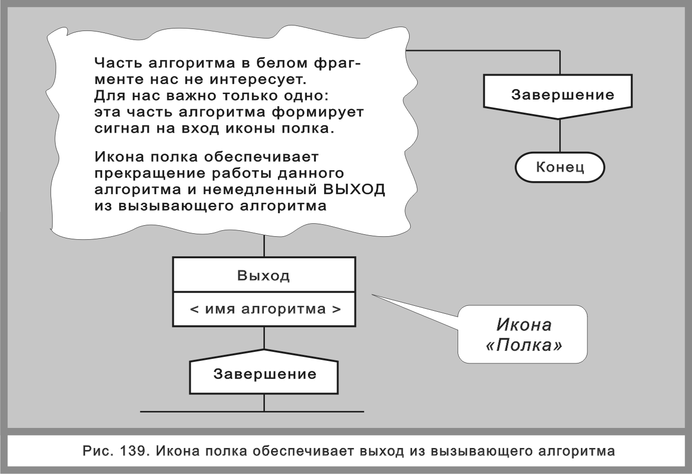 Фактически полка с надписью «Выход» играет роль конца работы. Иными словами (см. рис. 139), маршрут, доходя до полки, ОБРЫВАЕТСЯ. Происходит выход из алгоритма, но не через икону конец, а через икону полка. Полка играет роль конца.