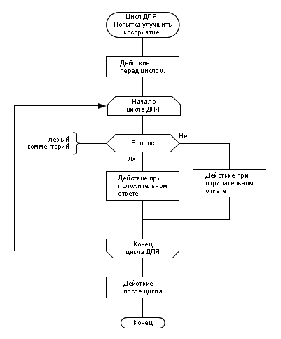 ... По работе, для общения с зарубежными коллегами я часто использую Дракон-диаграмы, так уж вышло что цикл For я в них практически не применял, а тут вот увидел ситуацию когда он как раз к месту, нарисовал и понял что цикла мои коллеги там не увидят, так как нет явного замыкания. Тогда я иконки конца и начала цикла For замкнул стрелкой с левой стороны, всё равно у нас диаграммы и "шампур" и ветки "силуета" растут вправо и вниз, так что слева место всегда есть. В общем замкнул и для себя понял что так воспринимать цикл гораздо удобнее, поэтому выношу предложение на обсуждение ;). Пример на картинке.