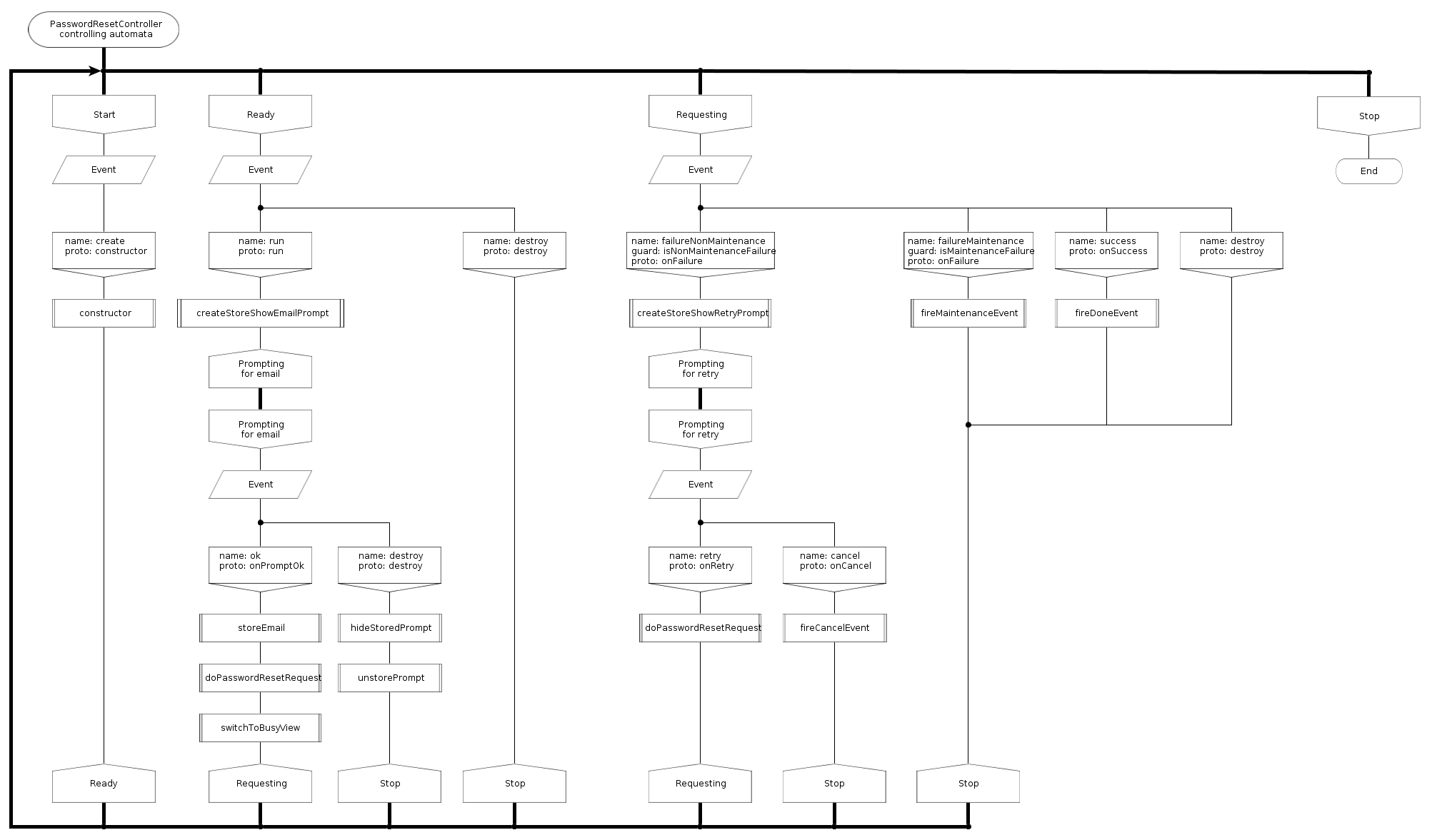 Например, в браузере достаточно сложно, иногда невозможно, сделать настоящий модальный диалог (если мы хотим чтобы приложение было одинаково совместимо со всеми браузерами), и допустим у нас выполняется некий асинхронный XHR (XmlHttpRequest) запрос к серверу, во время запроса, наш вид (V в MVC) мирно показывает индикатор выполнения запроса, и вдруг сервер "отвалился" (у пользователя кратковременно пропала связь с сетью), в таком случае контроллер, у меня, показывает модальное сообщение: "дескать нет соединения с сервером, не желает ли пользователь запрос повторить?". Пользователь в свою очередь может либо нажать кнопку "Повторить", либо "Отменить" операцию. При успешном завершении или отмене операции вид переключается в изначальное состояние, показывает какую нибудь форму ввода данных вместо индикатора выполнения запроса. Здесь - ожидание выполнения запроса сервером, и показывание предупреждения пользователю - два разных состояния контроллера. Пример диаграммы для контроллера формы сброса пароля пользователя дан ниже.