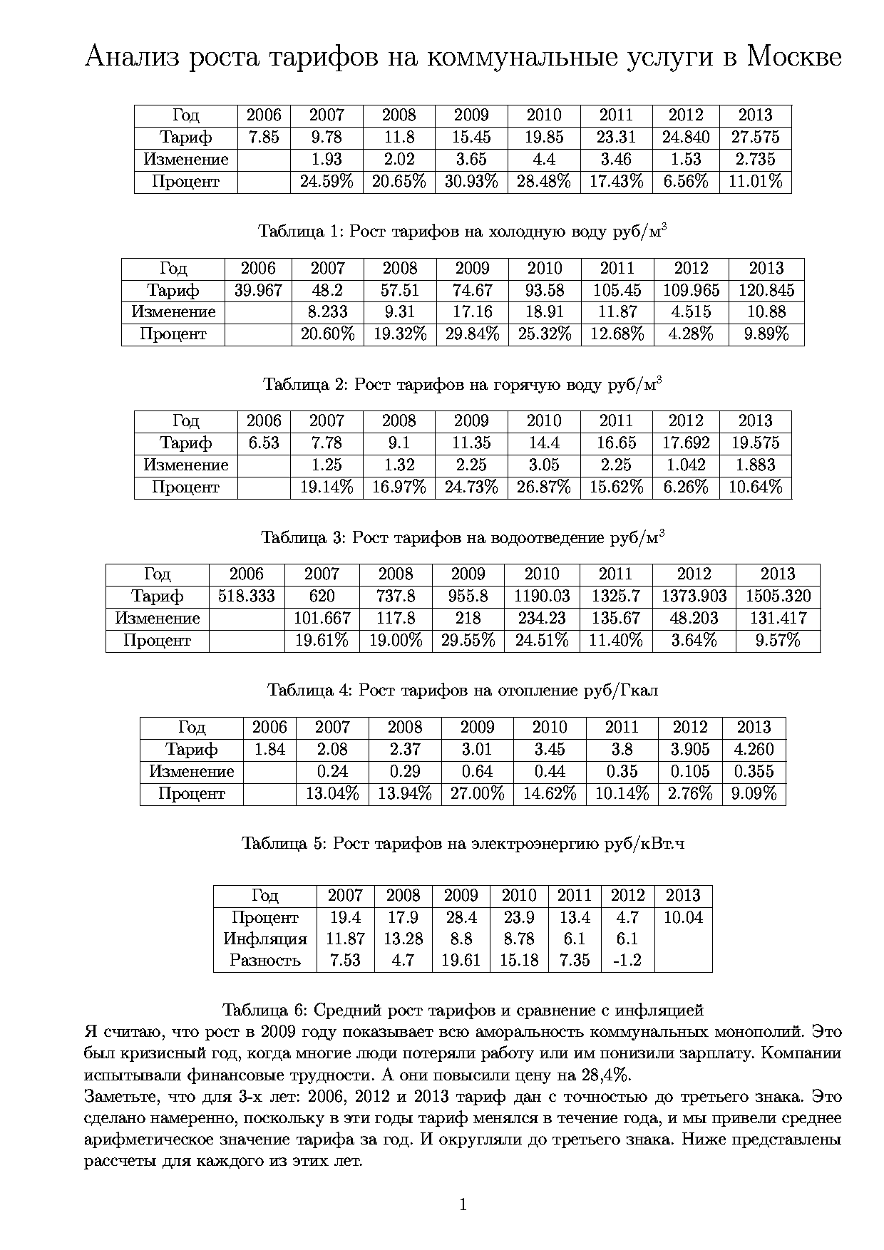 Уважаемые коллеги, я сделал маленькую работу, где анализируется рост коммунальных платежей в Москве. Работа включает 6 таблиц. Впринципе, воспринимается нормально, но какие будут идеи по улучшению качества материала. 2-ю страницу с рассчетами не влючаю сюда.