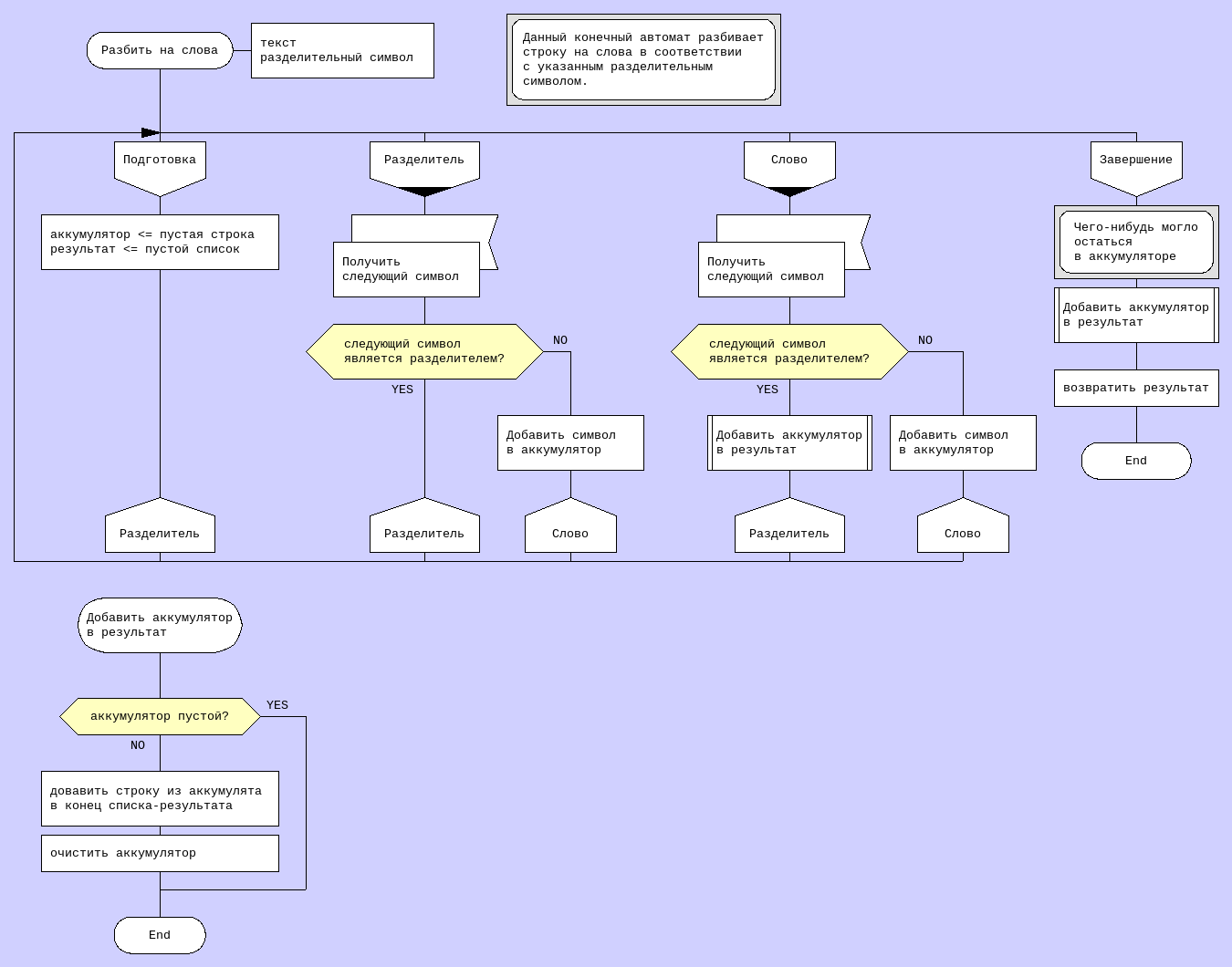 А вот пример реального автомата на ДРАКОН-Си, который производит несложный лексический анализ.