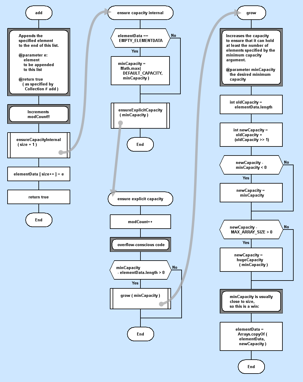 Привожу пример кода добавления нового элемента в список ArrayList со стрелками вызовов.