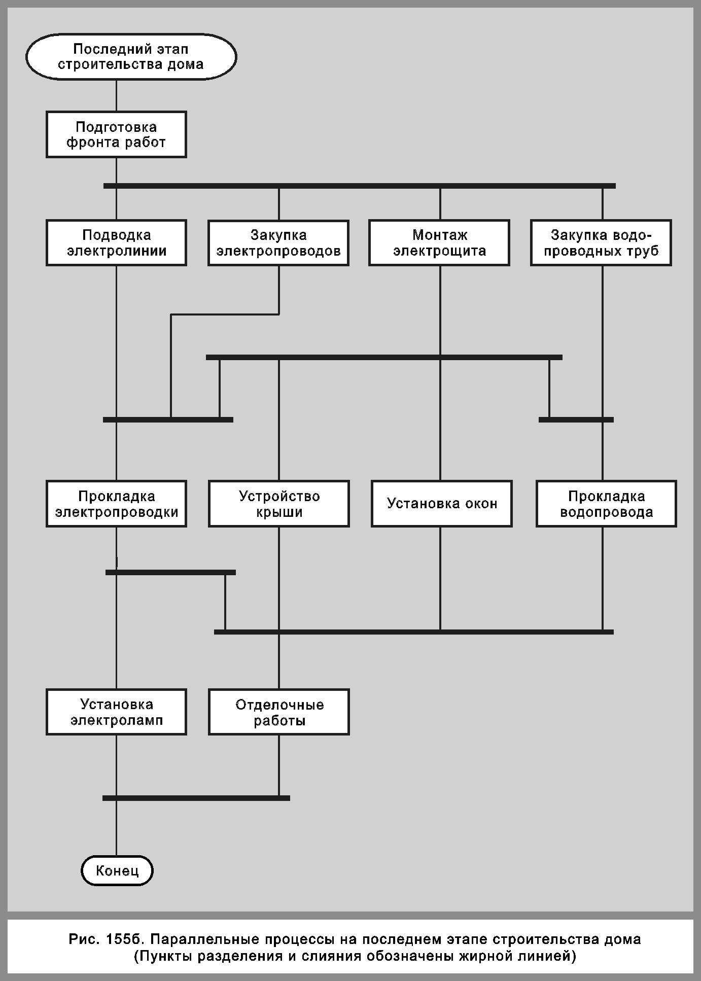 На рис. 152 изображены три жирных линии. Каждая из них символизирует начало параллельных процессов.